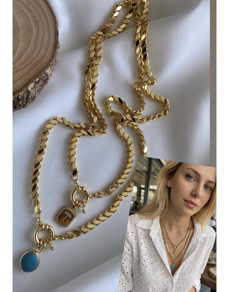 14k altın kaplama çelik halep zincir gemici kilit özel tasarım 60 cm firuze taşı kolye ve 45 cm harf kolye seti
