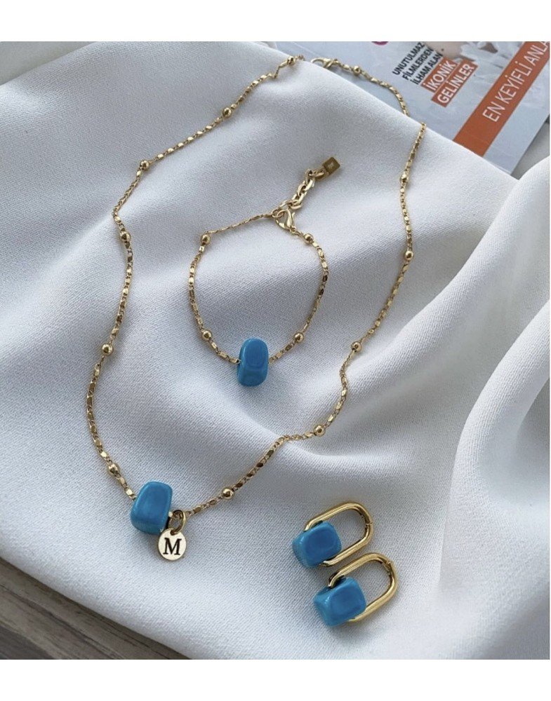 ezme arpa topcuk zincir nostalji mavi boncuk kolye bileklik ve küpe seti